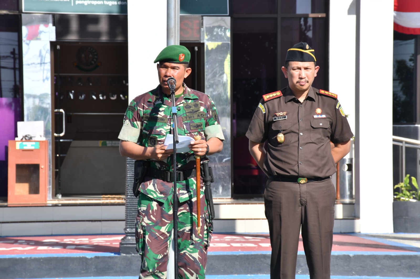 PONOROGO,BUSERJATIM.COM GROUP,-Komandan Kodim 0802/Ponorogo Letkol Inf Dwi Soerjono dan Kepala Kejaksaan Negeri Ponorogo Dr Teuku Herizal S.H., M.H. tadi pagi memimpin Apel Gelar Keamanan Kejaksaan Negeri Ponorogo Tahun 2025 bertempat di Lapangan Kantor Kejaksaan Negeri Kabupaten Ponorogo, Jumat (01/08/2025).