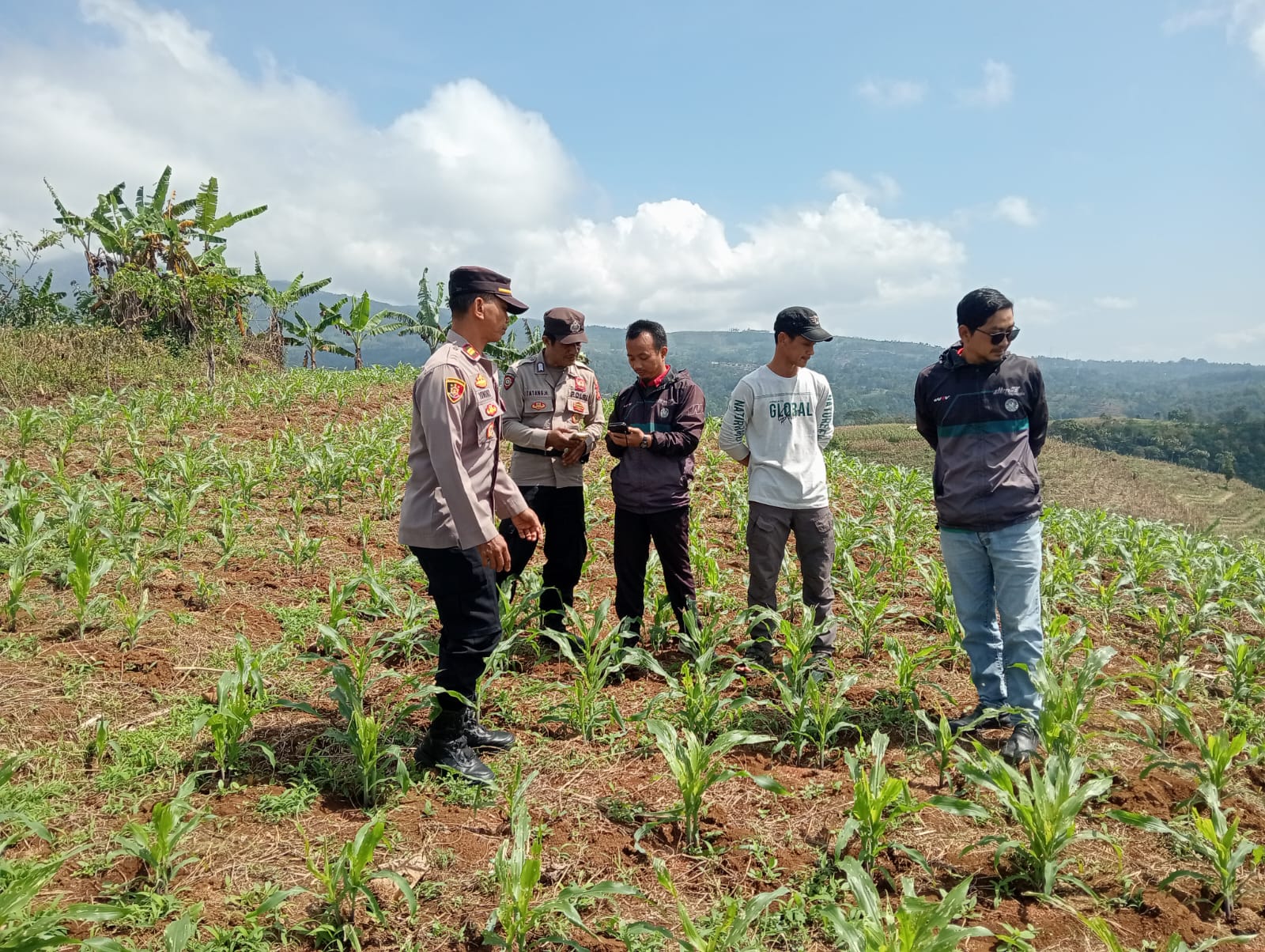 Kapolsek Malausma IPTU Yondri, S.Sos., M.H. bersama Bhabinkamtibmas Desa Girimukti, Bripka Tatang Hendrata, turun langsung ke lapangan didampingi Koordinator Balai Penyuluh Pertanian (BPP) Kecamatan Malausma, Deni Supriana, S.P., serta Penyuluh dan Pengurus Kelompok Tani “Gaya Tani”, Ridwan. Mereka bersama-sama melakukan pengecekan kondisi lahan pertanian jagung seluas kurang lebih 4 hektare yang berlokasi di Kebun Kiara Paranje, Desa Girimukti, Kecamatan Malausma.