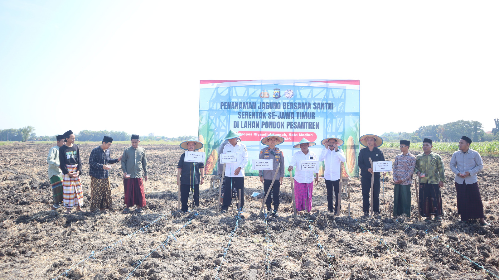 MADIUN,BUSERJATIM.COM GROUP– Polres Madiun Kota melaksanakan aksi nyata mendukung program swasembada pangan melalui kegiatan Penanaman Jagung Serentak di Lahan Pesantren, Rabu (6/8/2025), di lahan pertanian seluas 2 hektare di Jl. Tirtaraya, Kelurahan Nambangan Kidul, Kecamatan Manguharjo, Kota Madiun.