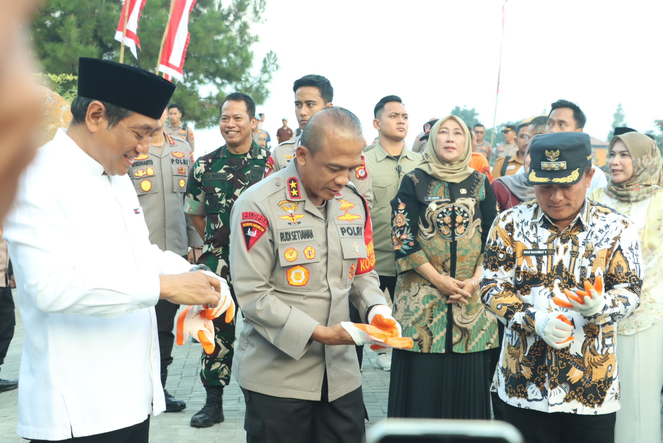 Kapolda Jawa Barat Irjen Pol. Rudi Setiawan, S.I.K., S.H., M.H., bersama Waka Polda Jabar Brigjen Pol. Adi Vivid A.B., S.I.K., M.Hum., M.S.M., Irwasda Polda Jabar Brigjen Pol. Rinto Prastowo, S.I.K., M.H., Anggota DPR RI sekaligus Direktur PT Puspita Group H. Rokhmat Ardiyan, M.M., serta Bupati Kuningan Dr. H. Dian Rachmat Yanuar, M.Si., melaksanakan penanaman bibit pohon Damar di kawasan Arunika Eatery, Kuningan. Kamis, (7/8/2025).