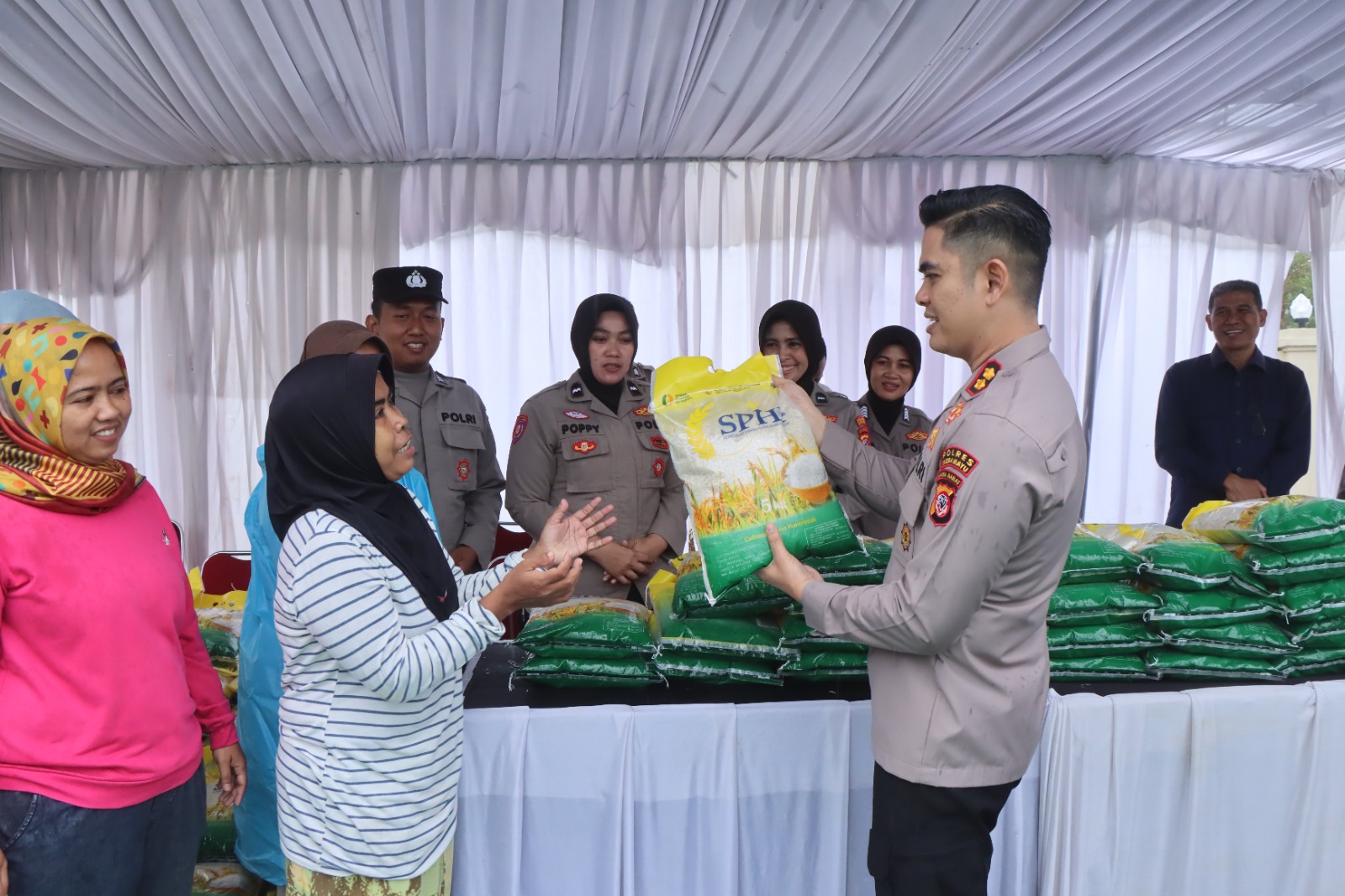 “Total 2 ton beras atau setara 400 kemasan 5 kg disalurkan dengan harga Rp 57.500 per kemasan,” ungkap AKP Tarno.