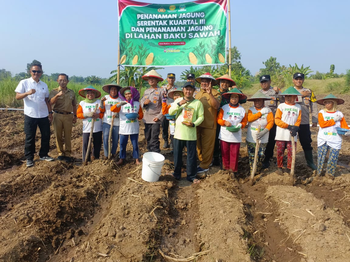 MADIUN , BUSERJATIM.COM GROUP – Polres Madiun Kota melalui Polsek Sawahan bersama unsur Forkopimcam, perangkat desa, dan kelompok tani melaksanakan Penanaman Jagung Serentak Kuartal III di lahan baku sawah Desa Pucangrejo, Kecamatan Sawahan, Kabupaten Madiun, Senin (11/8/2025) pagi.