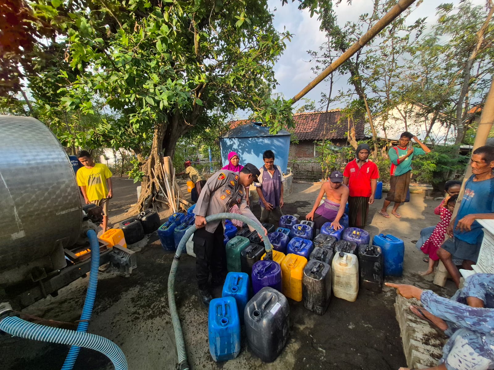 Warga terlihat antusias menyambut bantuan tersebut, mengingat musim kemarau telah menyebabkan berkurangnya pasokan air di wilayah mereka.