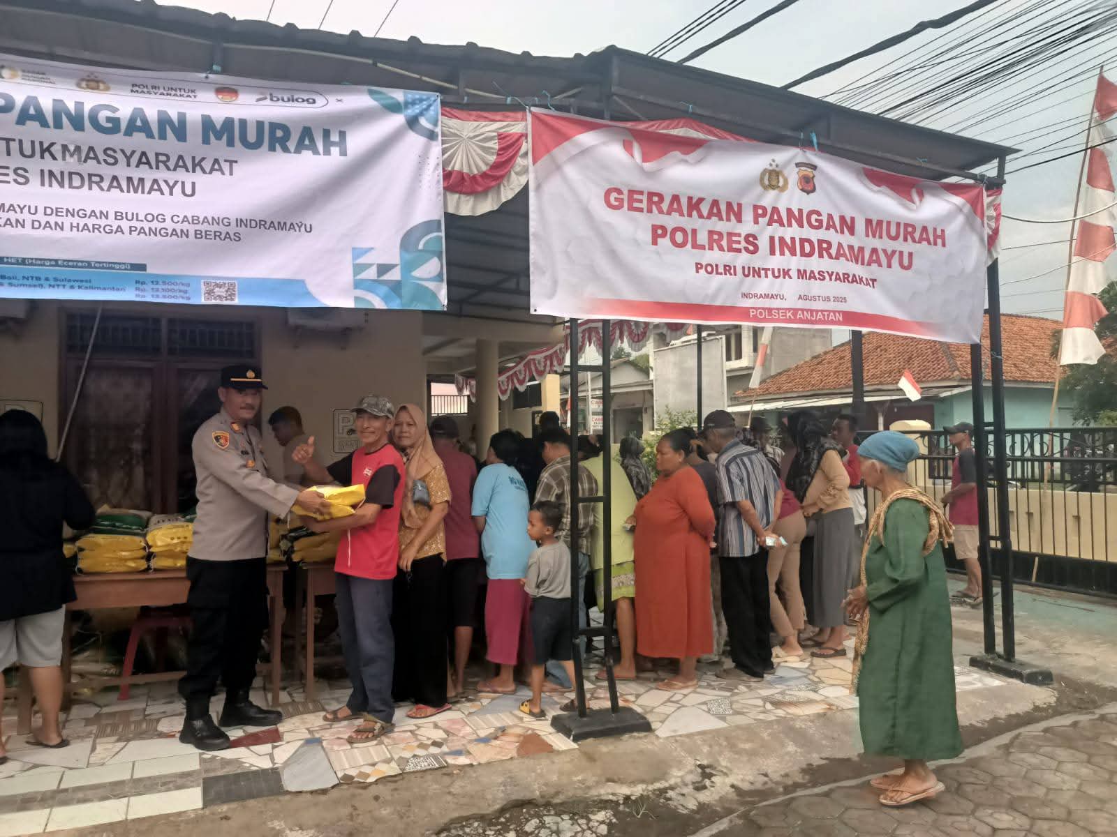 Indramayu, – Dalam upaya membantu masyarakat menghadapi tingginya harga kebutuhan pokok. Polsek Anjatan jajaran Polres Indramayu Polda Jabar menggelar kegiatan Gerakan Pangan Murah di Depan Mapolsek Anjatan, Kecamatan Anjatan, Kabupaten Indramayu, Kamis (14/8/2025).