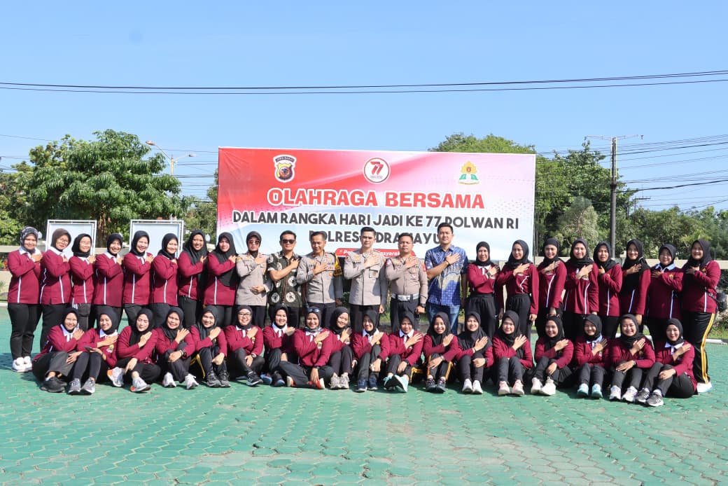 Terlihat Polwan Polres Indramayu bersama Bhayangkari Cabang Indramayu dan ASN wanita Polres Indramayu menggelar olahraga bersama dalam rangka memperingati Hari Jadi ke-77 Polisi Wanita (Polwan) Republik Indonesia.