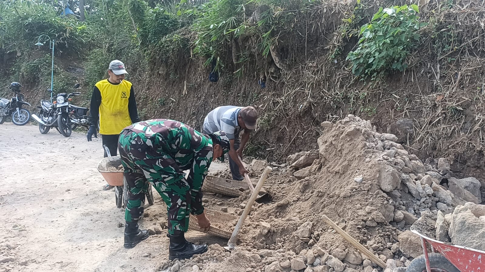 Peduli Lingkungan, Babinsa Koramil Ngrambe Bersama Warga Kerja Bakti Perbaikan Jalan