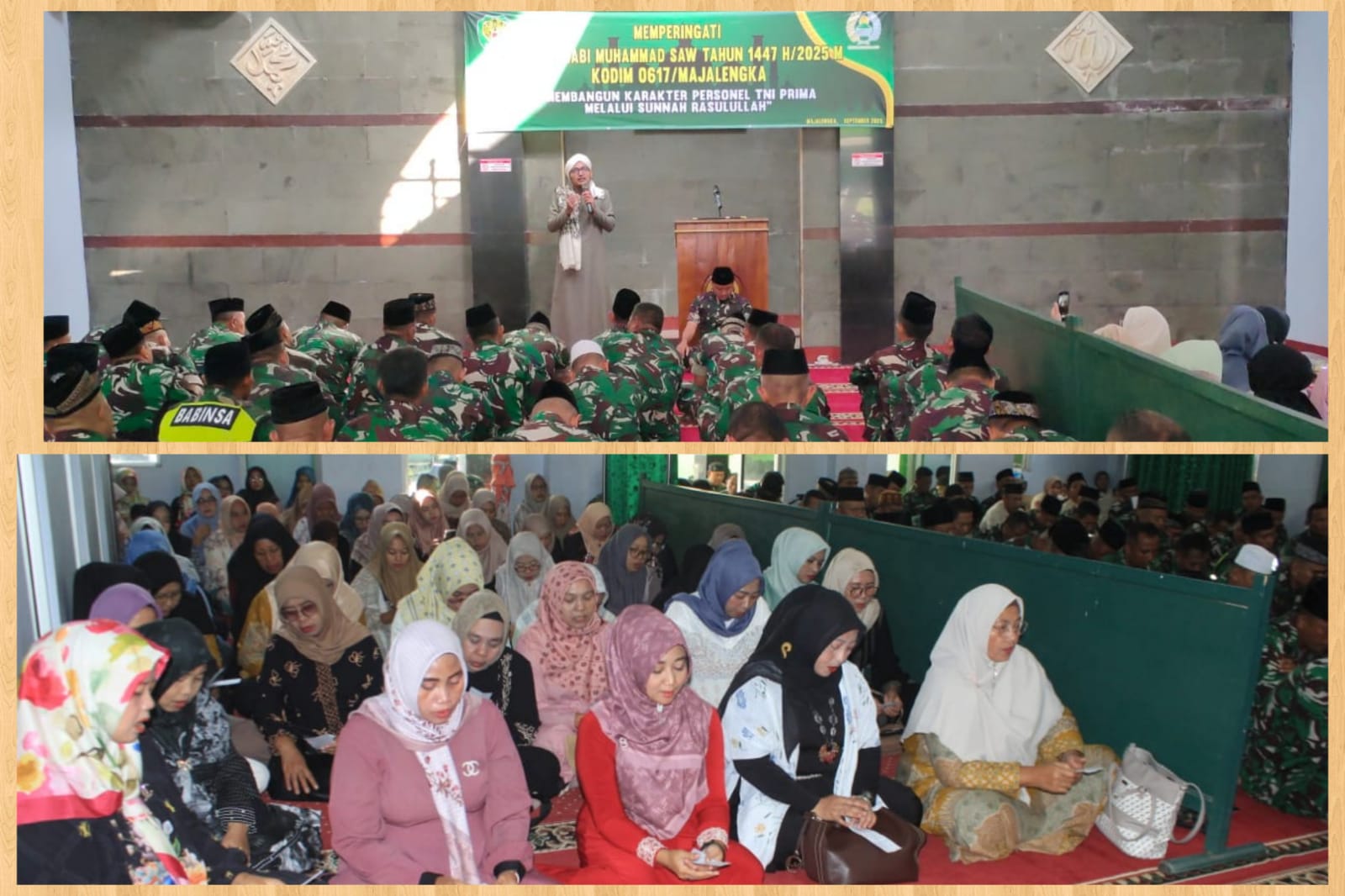 Majalengka – Kodim 0617/Majalengka bersama Persit Kartika Chandra Kirana (KCK) Cabang XVIII memperingati Maulid Nabi Muhammad SAW 1447 H/2025 di Masjid Al Ikhlas, Jalan KH. Abdul Halim No. 403, Kelurahan Tonjong, Kabupaten Majalengka, Kamis (4/9/2025).