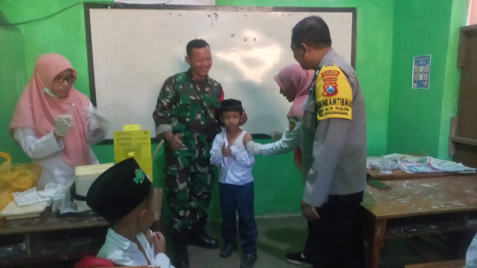 Kegiatan vaksinasi tersebut ditujukan bagi para pelajar dengan tujuan meningkatkan imunitas tubuh sekaligus mencegah penularan penyakit yang dapat mengganggu kesehatan dan kegiatan belajar. Dalam kesempatan itu, Babinsa ikut membantu kelancaran jalannya vaksinasi dengan memastikan para siswa tertib mengikuti arahan tenaga kesehatan.