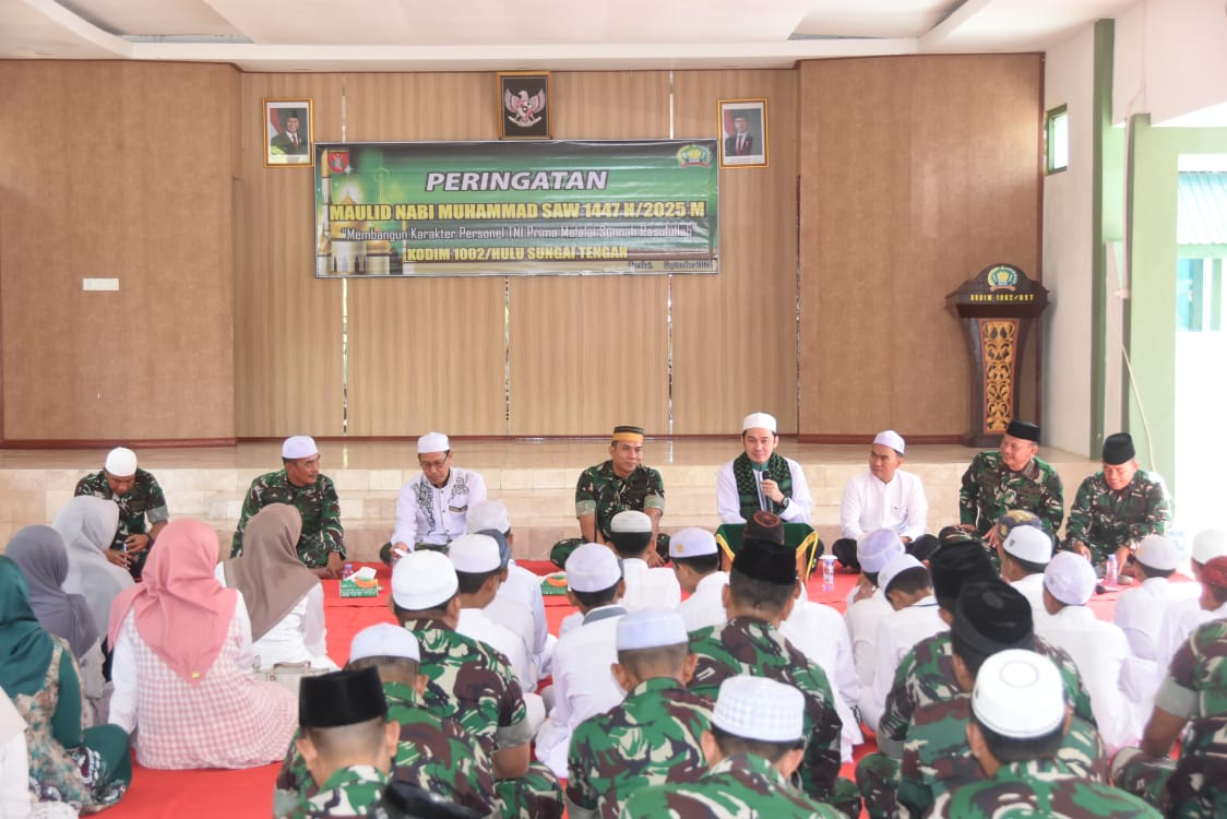 Dalam sambutannya, Dandim 1002/HST menegaskan bahwa peringatan Maulid Nabi bukan sekadar seremonial tahunan, namun menjadi momentum penting untuk meneladani akhlak Rasulullah SAW.