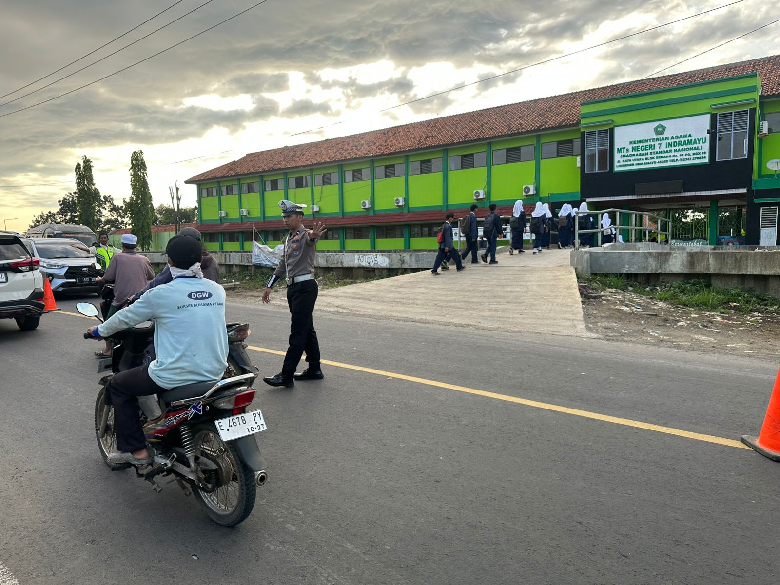 Kegiatan berlangsung sejak pukul 06.00 WIB di depan MTSN 7 Lohbener dengan melibatkan personel Bripda Tyo Prasetya Darmawan.