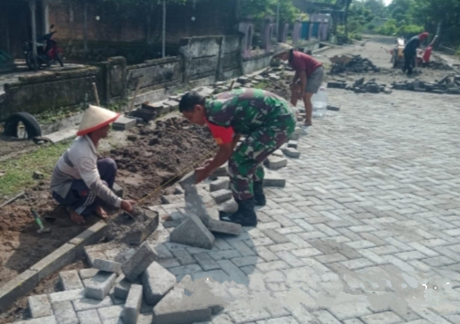 Babinsa Desa Gading Gotong Royong Bersama Warga Pasang Paving Jalan