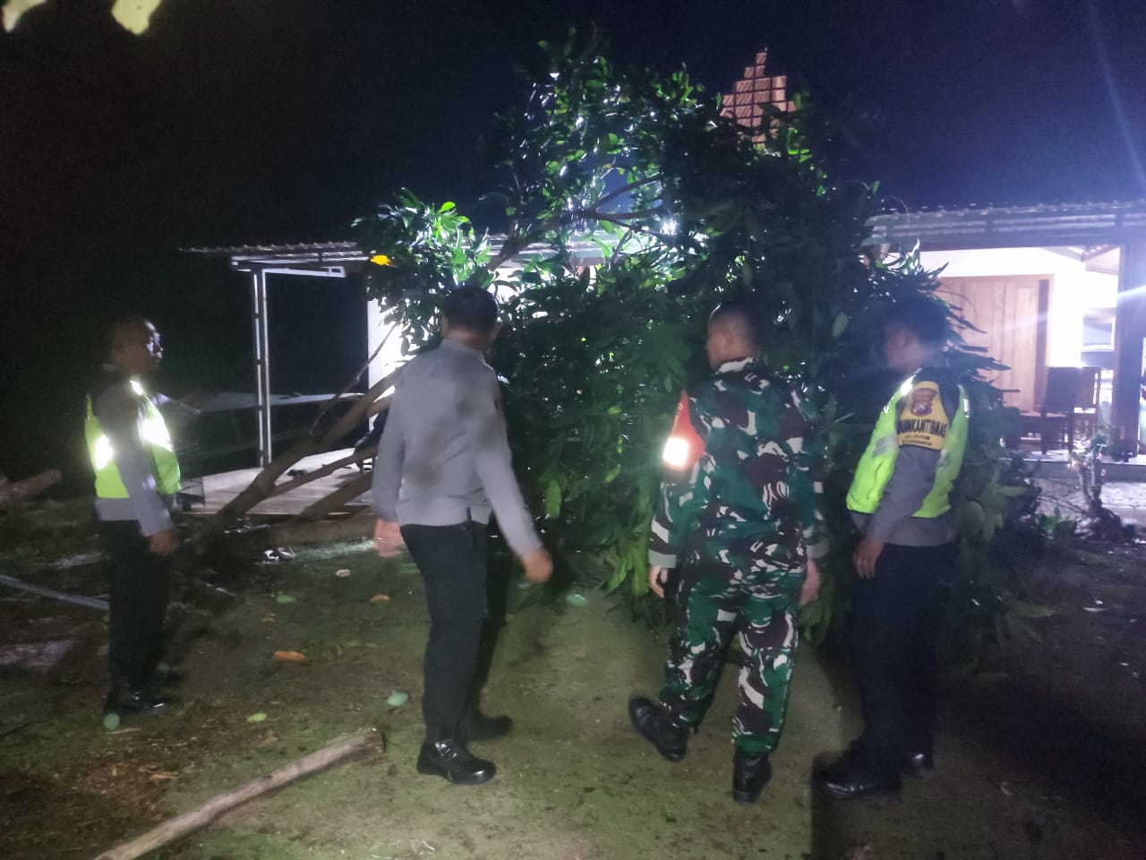 Menindaklanjuti laporan masyarakat, anggota Polsek Karanganyar bersama Kapolsek Iptu Supriyanto, S.H., langsung mendatangi lokasi kejadian. Petugas melakukan evakuasi pohon tumbang yang menutupi jalan serta membantu warga membersihkan material reruntuhan bangunan.