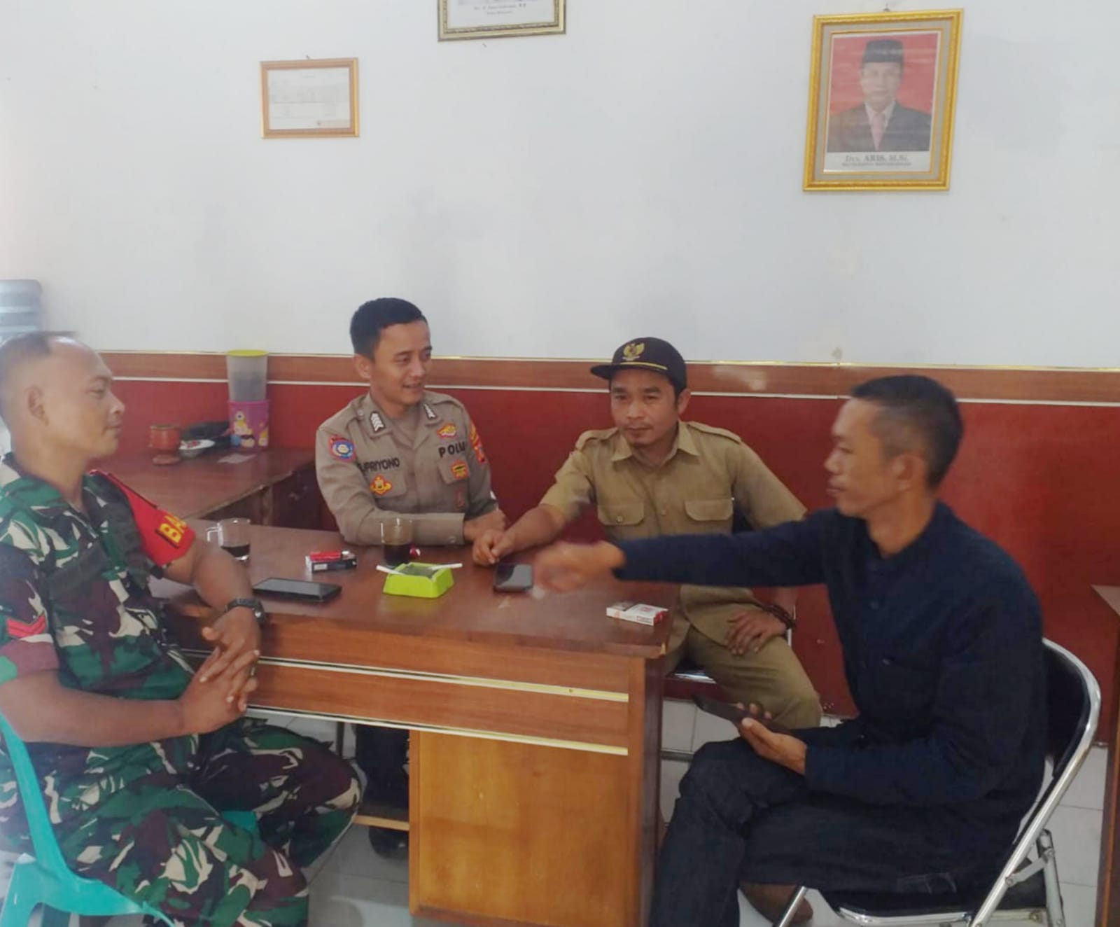 Dalam kesempatan tersebut, Anggota TNI-Polri tidak lupa untuk memberikan imbauan dan sampaikan pesan-pesan kamtibmas sekaligus mengajak Perangkat Desa untuk lebih meningkatkan kewaspadaan dan kepedulian guna untuk mengantisipasi dan mencegah segala macam bentuk gangguan kamtibmas.