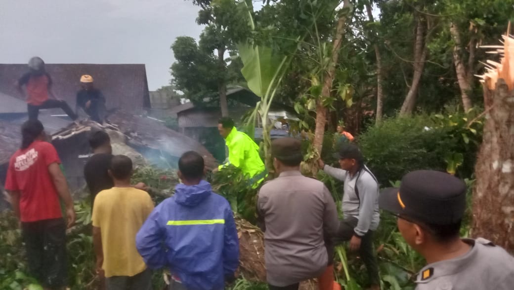 Personel Polri bersama warga setempat kemudian melakukan evakuasi dan pembersihan material pohon tumbang yang menimpa dapur rumah korban.