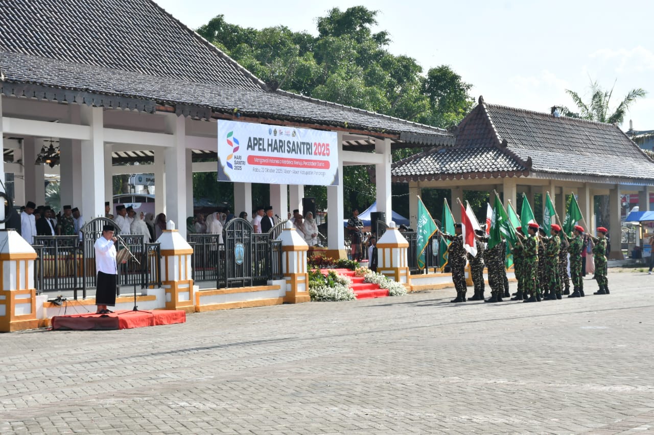 PONOROGO,BUSERJATIM.COM GROUP,- Kasdim 0802/Ponorogo Mayor Inf Agus Budi Cahyono mewakili Komandan Kodim 0802/Ponorogo Letkol Inf Dwi Soerjono menghadiri Apel Besar Hari Santri Nasional tahun 2025 bertempat di Aloon Aloon Kota / Kabupaten Ponorogo, Rabu (22/10/2025).