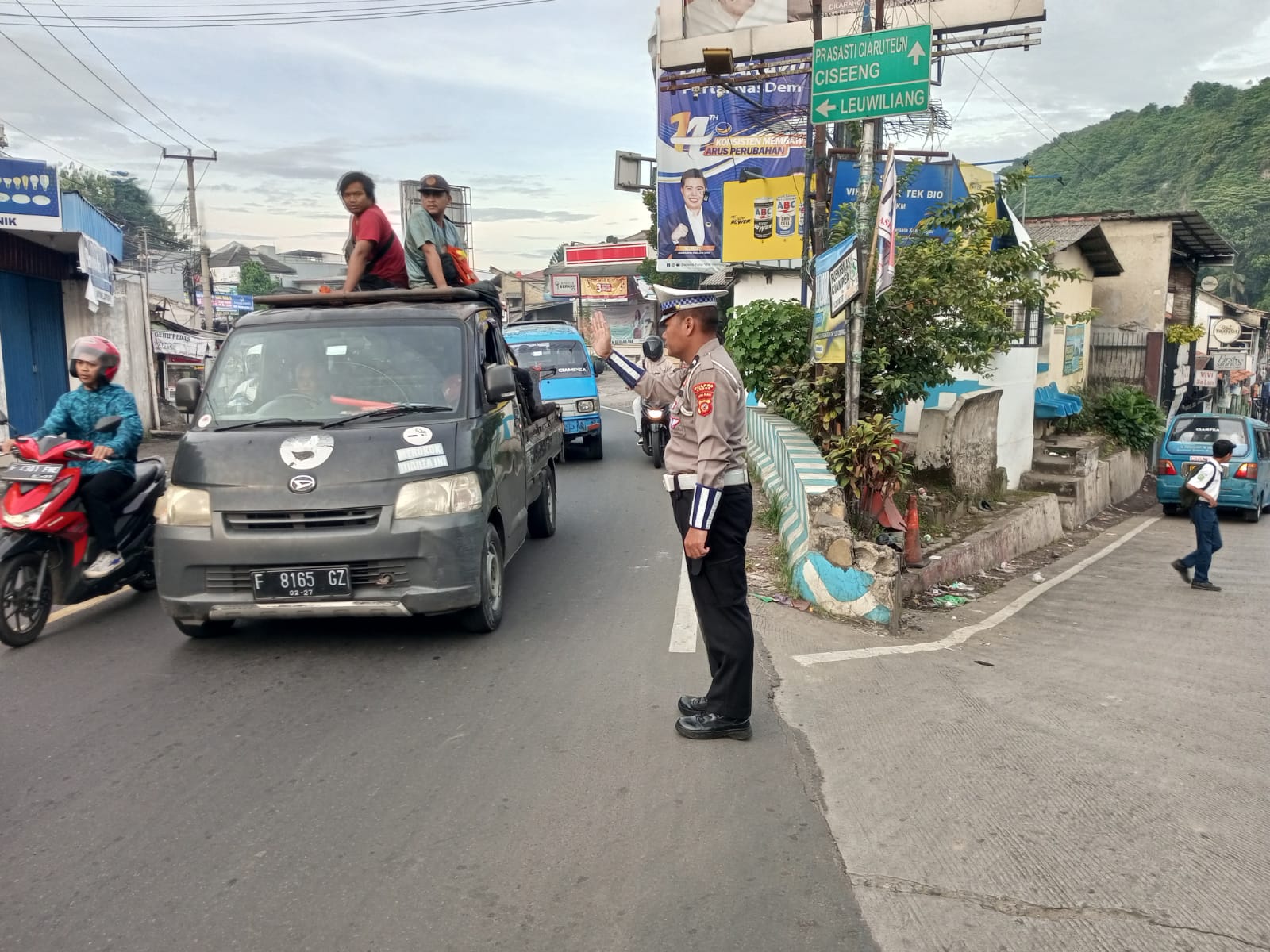 Anggota Unit Lantas Polsek Ciampea turut membantu masyarakat yang hendak menyeberang jalan, terutama pada jalur padat kendaraan. Petugas memberikan arahan kepada pengendara agar tetap tertib serta memperhatikan keselamatan selama berkendara.