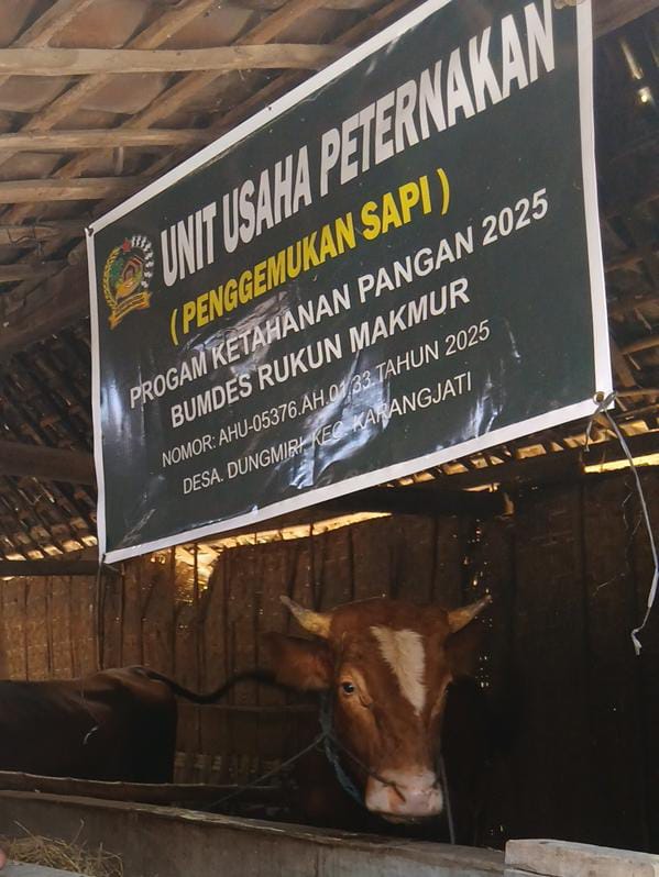 Ngawi ,Lacakberita.com— Pemerintah Desa Dungmiri, Kecamatan Karangjati, Kabupaten Ngawi, terus mendorong penguatan ekonomi desa melalui Badan Usaha Milik Desa (BUMDes) Rukun Makmur. Salah satu program unggulan yang saat ini dijalankan adalah Unit Usaha Peternakan Sapi (Penggemukan Sapi) sebagai bagian dari Program Ketahanan Pangan Tahun 2025.
