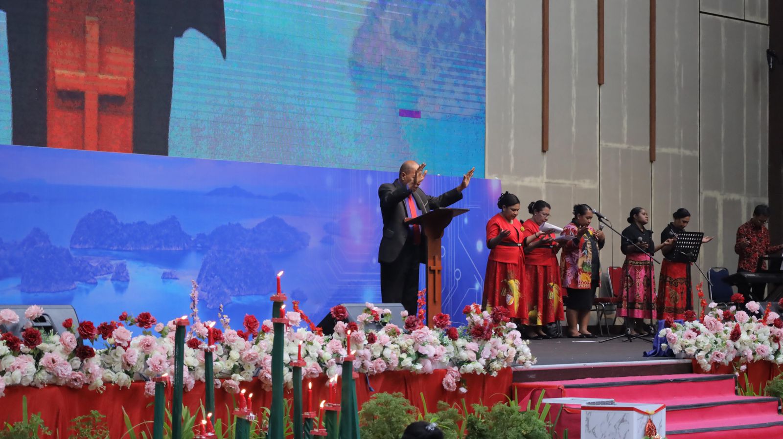 SORONG PBD, BUSERJATIM.COM GROUP — Panglima Armada III Laksamana Muda TNI Dato Rusman SN, S.E., M.Si., M.Tr.Opsla., yang diwakili oleh Komandan Satuan Kapal Amfibi Armada III Kolonel Laut (P) Yohanes Upang, menghadiri Ibadah Perayaan Natal Keluarga Besar IMEKKKO (Inanwatan, Matemani, Kais, Kokoda, dan Kokoda Utara) yang diselenggarakan di Gedung Lambert Tjitmau, Kota Sorong, (06/01)malam.