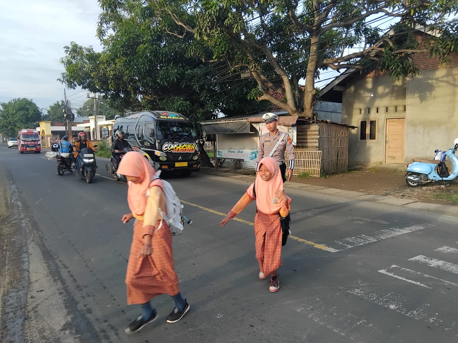 Adalah Bripda Tyo Prasetya Darmawan, personel Polsek Lohbener Polres Indramayu Polda Jabar yang melakukan pengaturan lalu lintas sekaligus membantu para pelajar di seberang jalan, Kamis (22/1/2026).