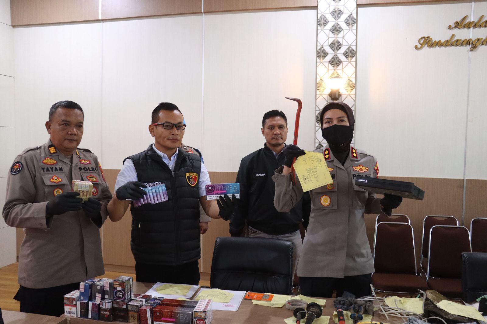 Dari tangan para tersangka, polisi mengamankan berbagai barang bukti, di antaranya alat kejahatan seperti gunting seng, linggis, obeng, pahat, palu, potongan kabel dan DVR CCTV, berbagai jenis rokok dan kosmetik, pakaian yang digunakan pelaku, serta satu unit sepeda motor yang digunakan sebagai sarana kejahatan.