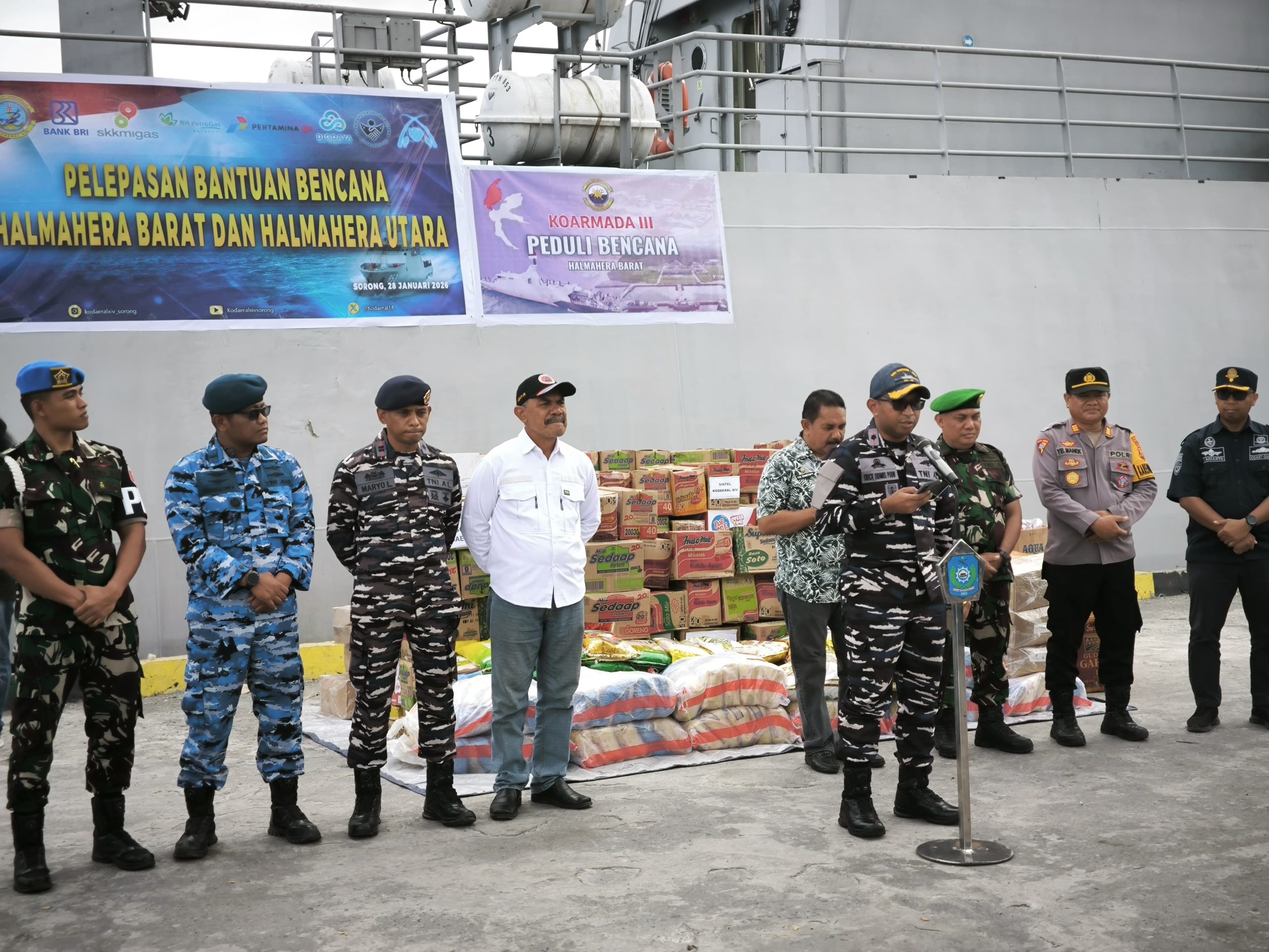 Dalam rangka mendukung upaya kemanusiaan tersebut, KRI Tatihu-853 melaksanakan pendistribusian bahan kontak berupa bantuan logistik yang diperuntukkan bagi masyarakat terdampak bencana. Bahan kontak tersebut berasal dari Komando Daerah Angkatan Laut (Kodaeral) XIV serta Pemerintah Kabupaten Sorong sebagai wujud kepedulian dan sinergi antarinstansi dalam membantu korban bencana alam.