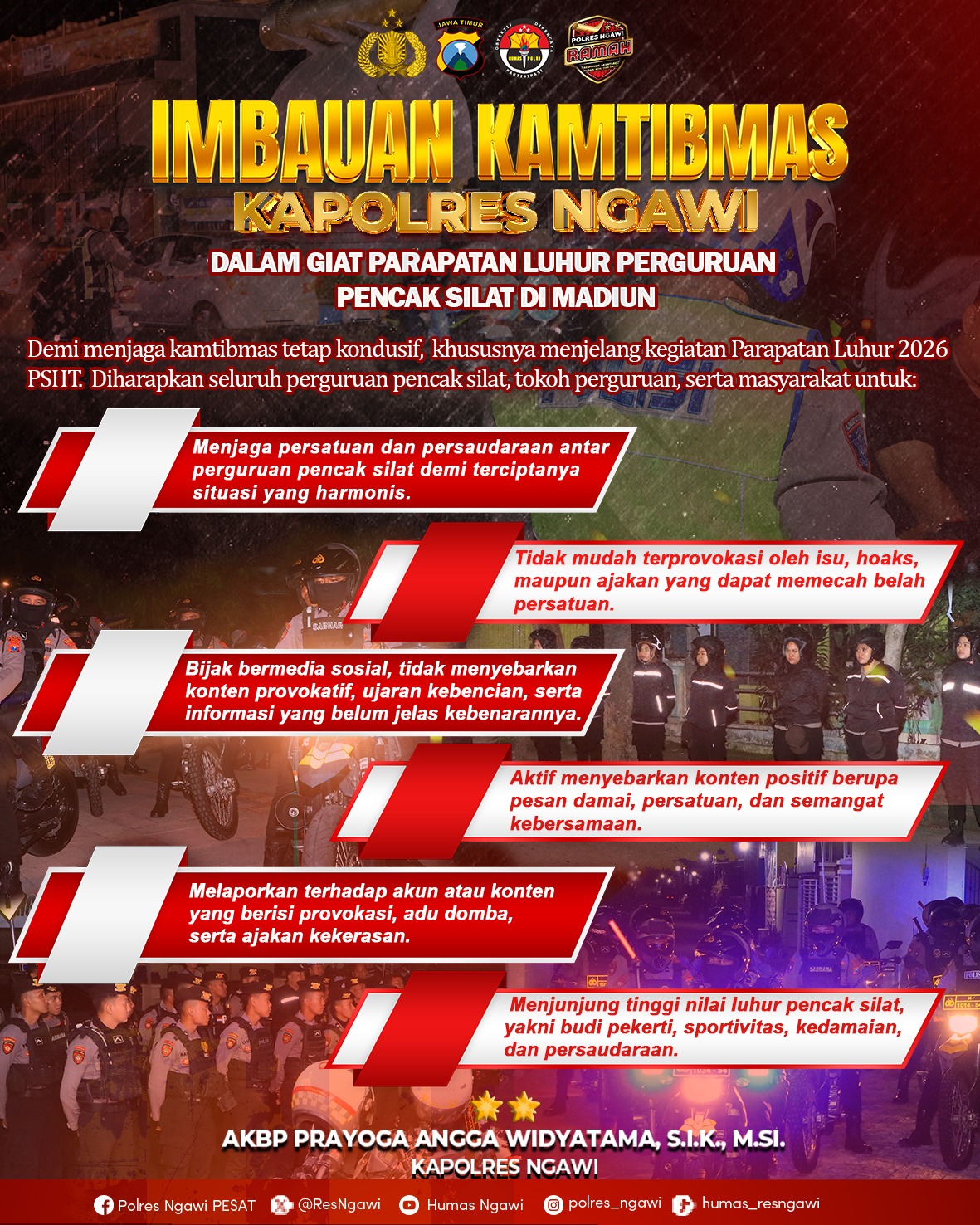 Ngawi, Dalam rangka menjaga situasi kamtibmas yang aman, damai, dan kondusif, menjelang kegiatan Parapatan Luhur 2026, Kapolres Ngawi AKBP Prayoga Angga Widyatama, S.I.K., M.Si. mengimbau kepada seluruh perguruan pencak silat, tokoh perguruan, serta masyarakat untuk bersama-sama: