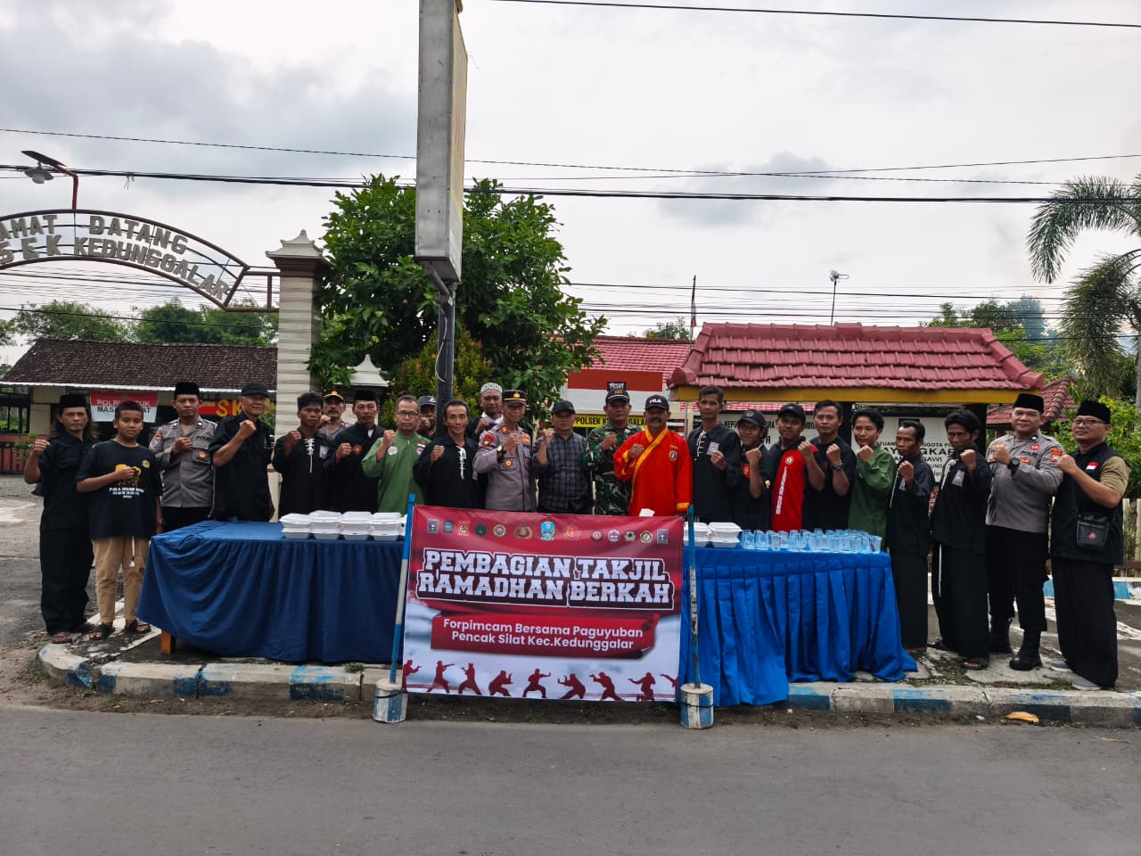 NGAWI, BUSERJATIM.COM GROUP – Dalam rangka menjaga keamanan dan kenyamanan warga selama bulan suci Ramadan, Babinsa Koramil Kedunggalar, Kodim 0805/Ngawi bersama anggota Polsek Kedunggalar melaksanakan pengamanan kegiatan pembagian takjil serta pemasangan banner ucapan Ramadan yang digelar paguyuban pencak silat di wilayah Kecamatan Kedunggalar, Kabupaten Ngawi. Minggu (22/2/2026).