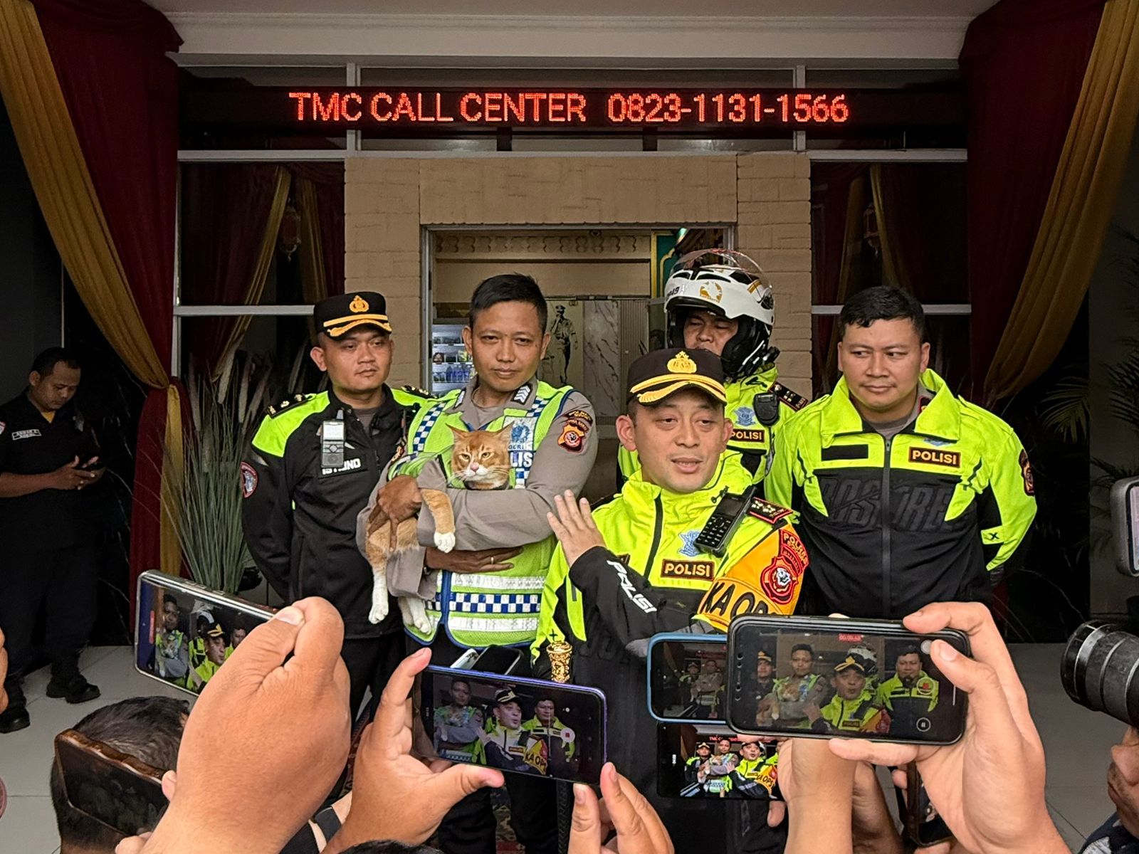 BOGOR – Ada pemandangan menarik dan tidak biasa di Pos Terpadu Gadog dalam gelaran Operasi Ketupat Lodaya 2026. Di tengah hiruk-pikuk arus lalu lintas menuju Puncak, seekor kucing berwarna oranye (oyen) yang mengenakan seragam polisi mini tampak tenang menyapa para wisatawan.