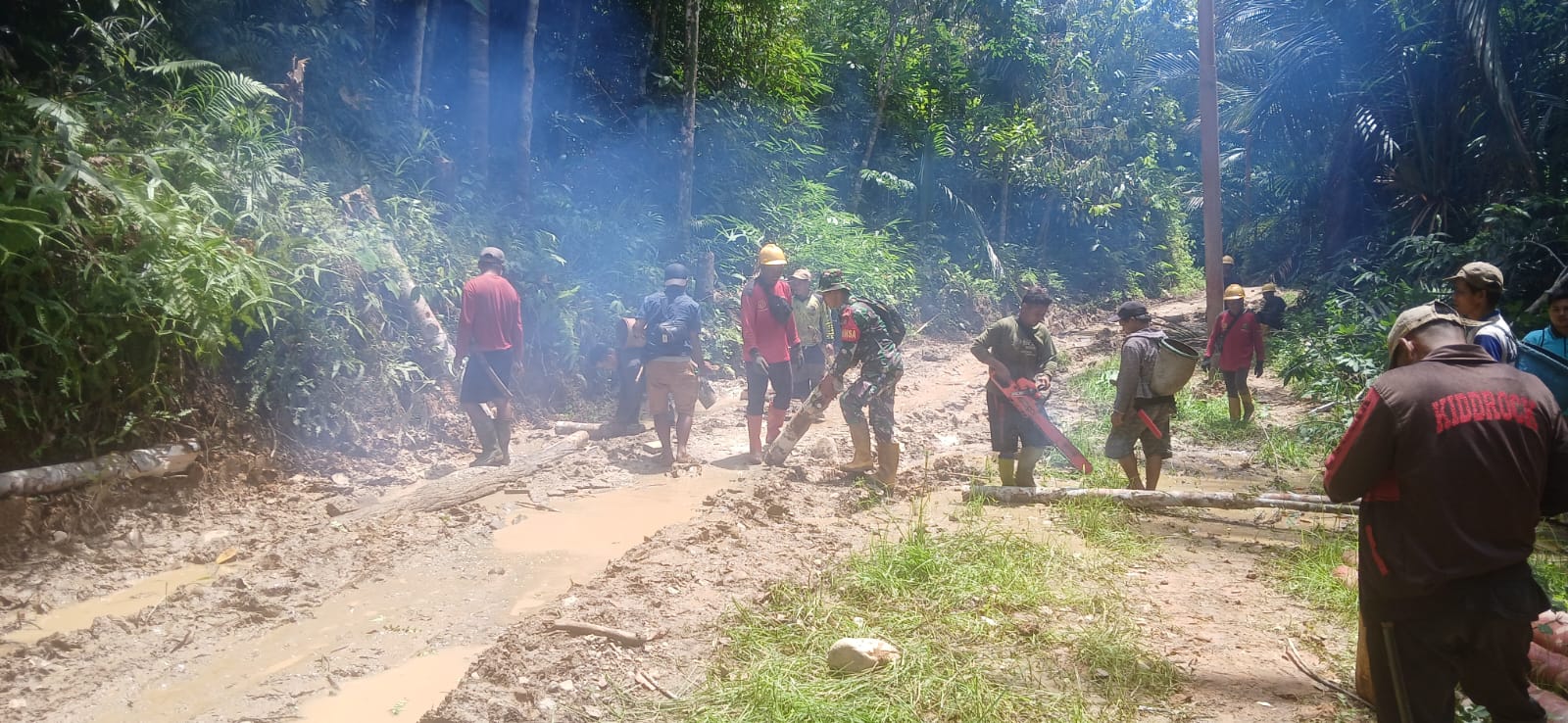 Babinsa dan Warga Atiran Gotong Royong Bersihkan Jalan Dukung Program Listrik Desa