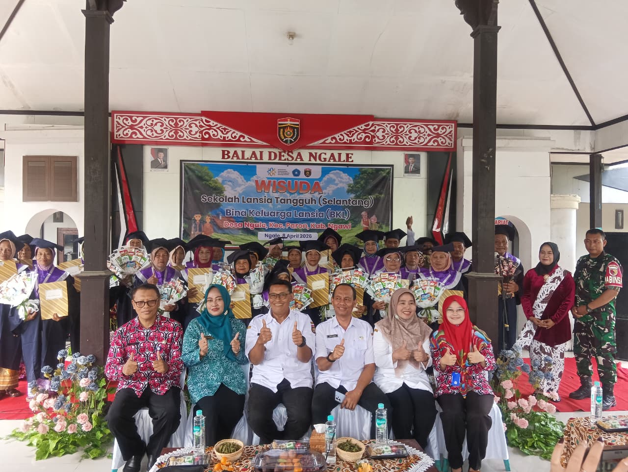 NGAWI, BUSERJATIM.COM GROUP- Bintara Pembina Desa Koramil 0805/02 Paron Kodim Ngawi bersama Bhabinkamtibmas turut hadir dalam acara Wisuda Sekolah Lansia Tangguh (Selantang) yang berlangsung di Balai Desa Ngale Kecamatan Paron, Rabu (08/04/2026).