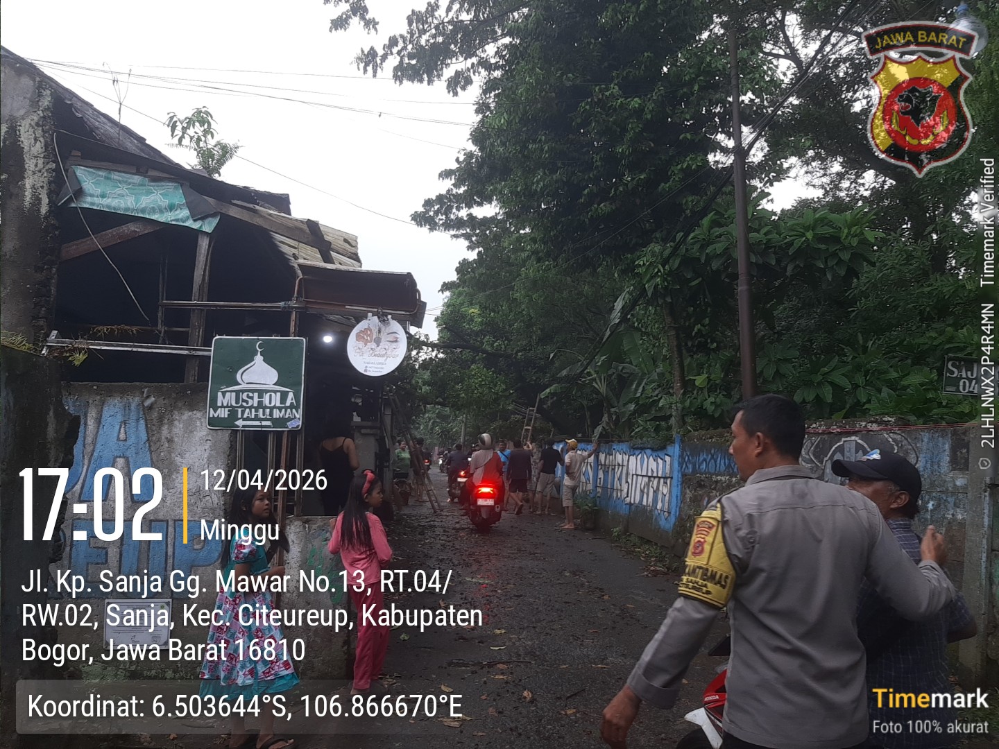 BOGOR – Bhabinkamtibmas Desa Sanja dan Desa Leuwinutug Aiptu Daryanto dan Aiptu M.Hambali, sekira jam 15.30 wib di Kp. Cikareo Rt 03/01 Desa Sanja dan RT.06/04 Desa Leuwinutug Kec Citeureup Kab Bogor, Monitoring Bangunan yang Rusak akibat Hujan Hebat, Minggu (12/04/2026).