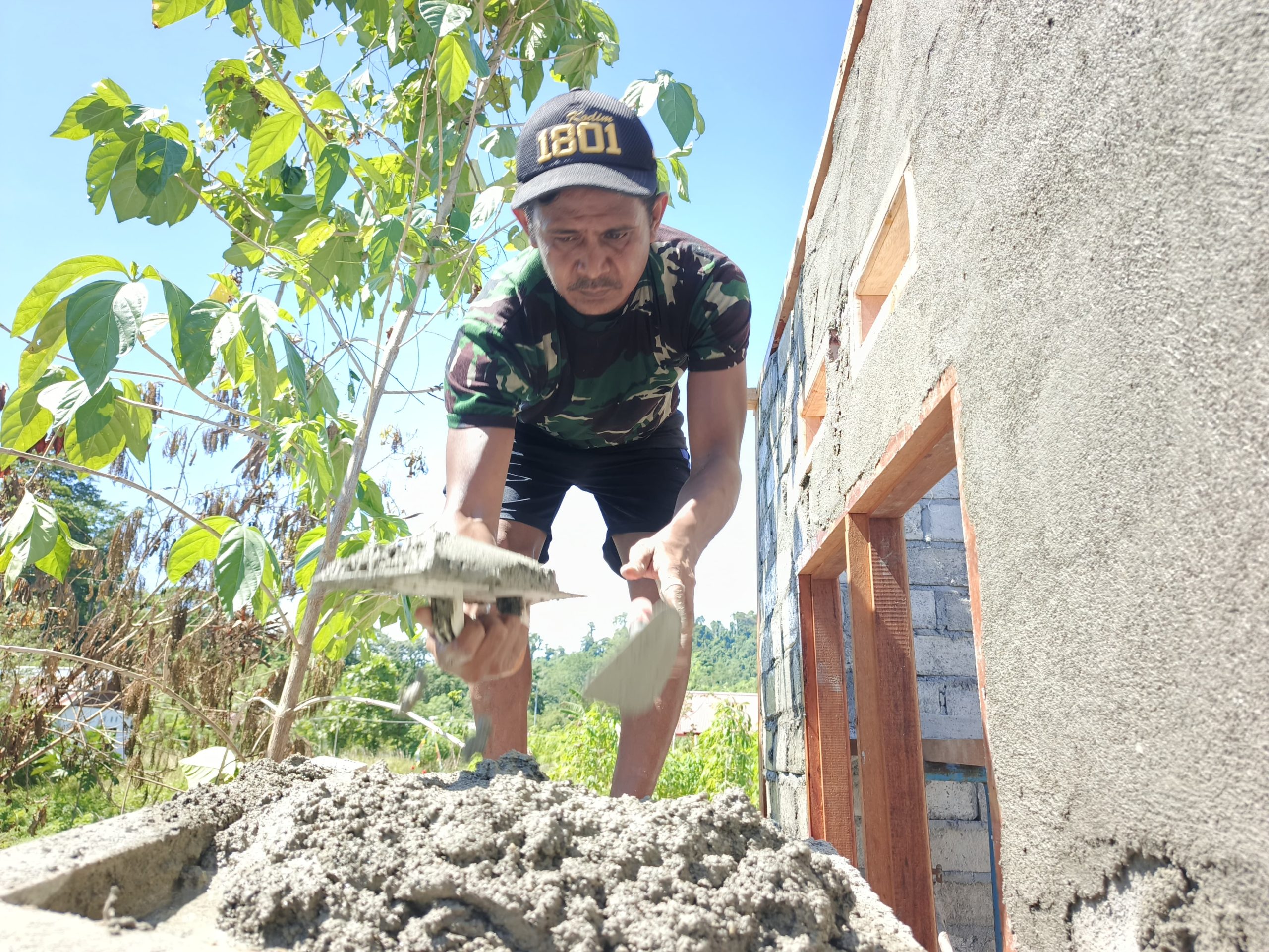 Pekerjaan plester dilakukan secara gotong royong oleh personel Satgas TMMD bersama warga setempat. Tahap ini menjadi bagian penting dalam proses pembangunan rumah agar bangunan semakin kokoh, rapi, dan nyaman untuk ditempati.